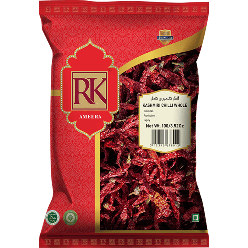 Kashmiri chillies are dried whole peppers known for their deep red color and mild heat. These whole chillies add a distinct flavor and vibrant color to dishes. Kashmiri chillies are often used in Indian cuisine, especially in Kashmiri recipes, for their unique taste. They can be crushed, ground, or used whole to enhance the flavor and appearance of various dishes.